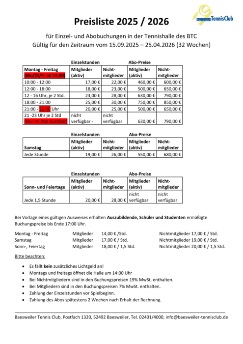 Die Preisliste gibt eine Übersicht über Einzelpreise und Abonnementspreise für die Tennishalle des BTC in der Wintersaison.